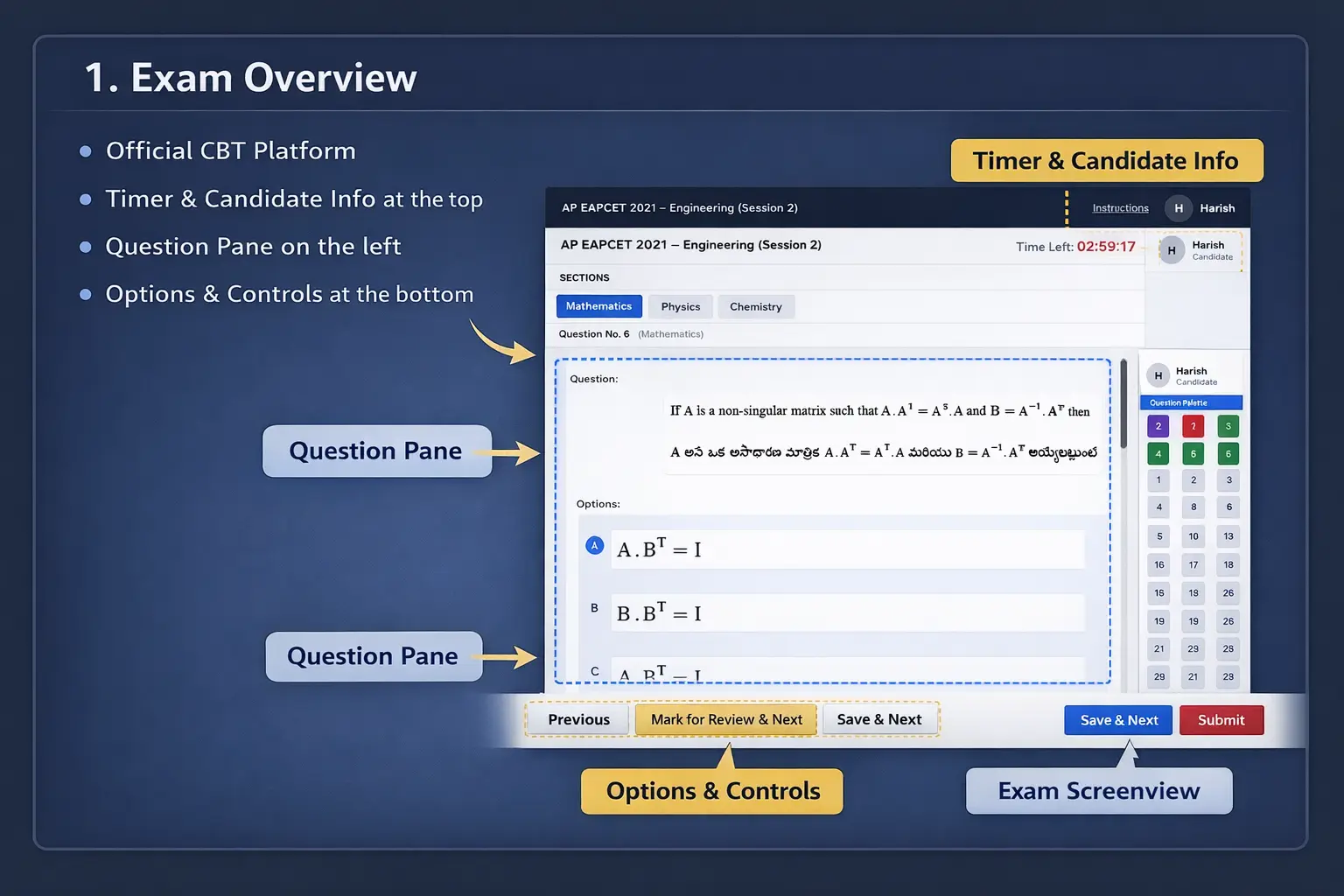 Exact same screen layout, question navigation, and controls as real APECET exam.